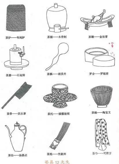 《茶具图赞》是我国第一部以图谱形式写茶具的专著。审安老人用白描画法绘制出了宋代著名斗茶所用的茶具12件,称为“十二先生”。