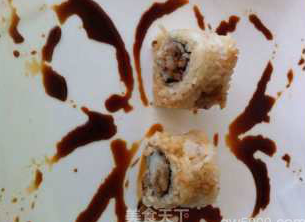 用海苔将米饭肉丁卷出寿司。再用保鲜膜将寿司做芯再包裹一层。寿司芯还做土豆丁馅料的。也算荤素搭配。
