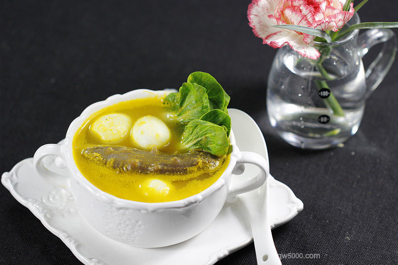 7加入发制好的海参和煮熟的鹌鹑蛋;