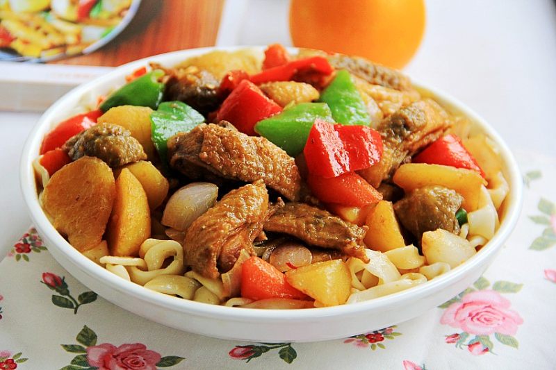 青红椒洋葱炒至断生后即可,将焖煮好的鸡块等盖在面条上