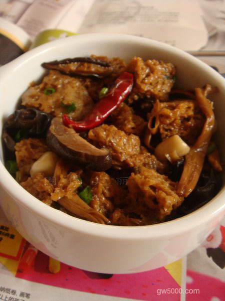 6锅中继续加点油,放入八角,出香味后加入香菇和木耳翻炒几下,加入黄花菜。