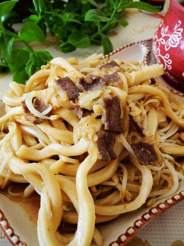 我用的是包饺子剩下的面,单独制作拉条子的面,在和面的时候一定要加些呀和一个鸡蛋,这样做出来的拉条子在劲道。