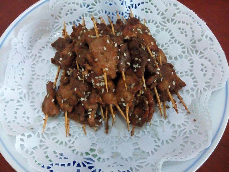 同事教的做法里,拌肉有加少许五香粉,我在家找不到五香粉,就没放,也挺好吃的,我还加了些白芝麻,牙签肉串就更好看了。