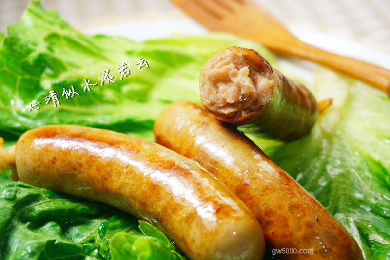 8.食用时,将煮熟的香肠从冷冻室拿出来放入平底锅中,冷油下锅煎或者炸,这样不容易焦。用微波炉高火一分钟,效果也可以。这样的香肠才能达到脆皮的效果,外焦内Q,口感极佳!