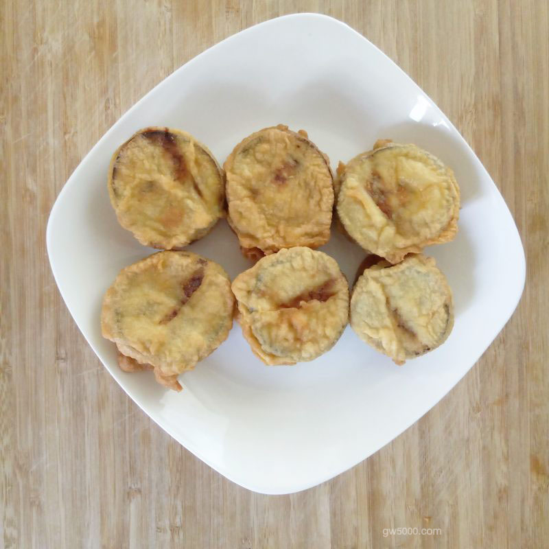 搅拌成面糊,面糊不能太稀,太稀挂不住面糊,也不能太干,太干茄汁上的面糊太厚,要把握好这个度。