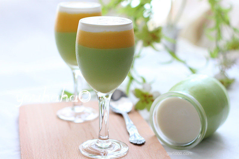 - 12在牛油果布丁中倒入1/3的芒果布丁液,凝固后倒入酸奶布丁液至满杯。