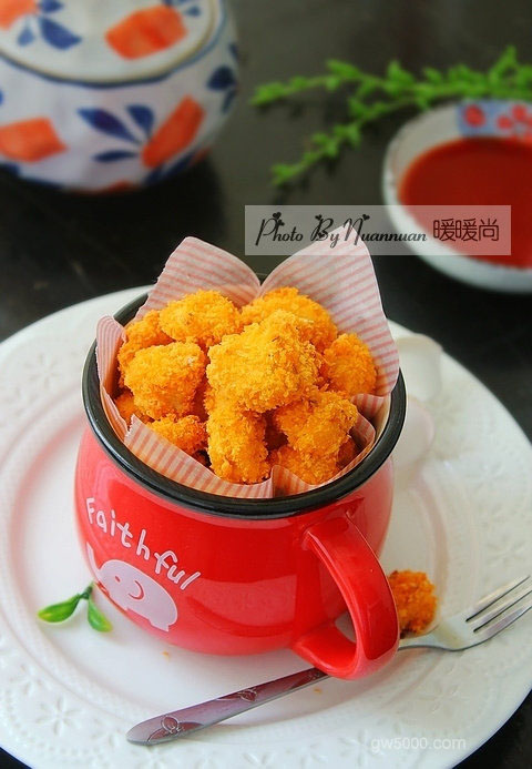 - 4最后鸡丁在面包糠里滚两圈,至鸡丁均匀的裹上面包糠,这就是半成品的鸡米花了。
