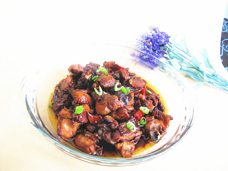 - 9稍稍加入一些水,刚好与没过鸡肉就可,盖锅煮至水干时,放入几粒冰糖。就出锅了。