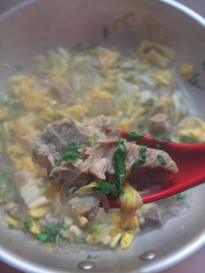 - 7加入泡好的粉丝,等汤继续烧开。(汤里面一旦加入新的食材冷的食材,汤温度是会下降的,所以要接着烧开哟)