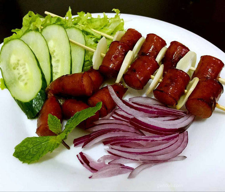 - 5把一片蒜一节肠的串起来,另外切些生菜丝,黄瓜片,洋葱丝上洒些盐,根据个人爱好,配着香肠吃比较解油腻。个人发现:洒了盐的洋葱丝配着香肠吃,还有股洋葱淡淡的甜味,很不错的哟,香肠也感觉没这么油了