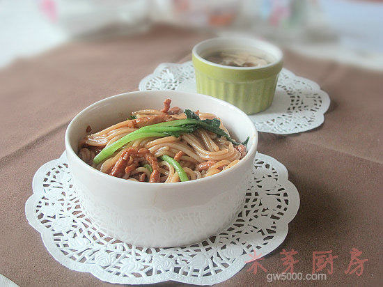 - 9沥干米粉时,可以准备一下配料:小青菜(有的地方称之为油菜)和肉丝。