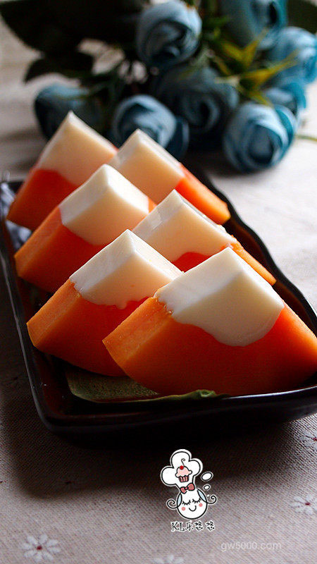 - 8木瓜从冰箱取出把木瓜顶打开,轻轻摇晃如果奶冻没有流质就可以了。