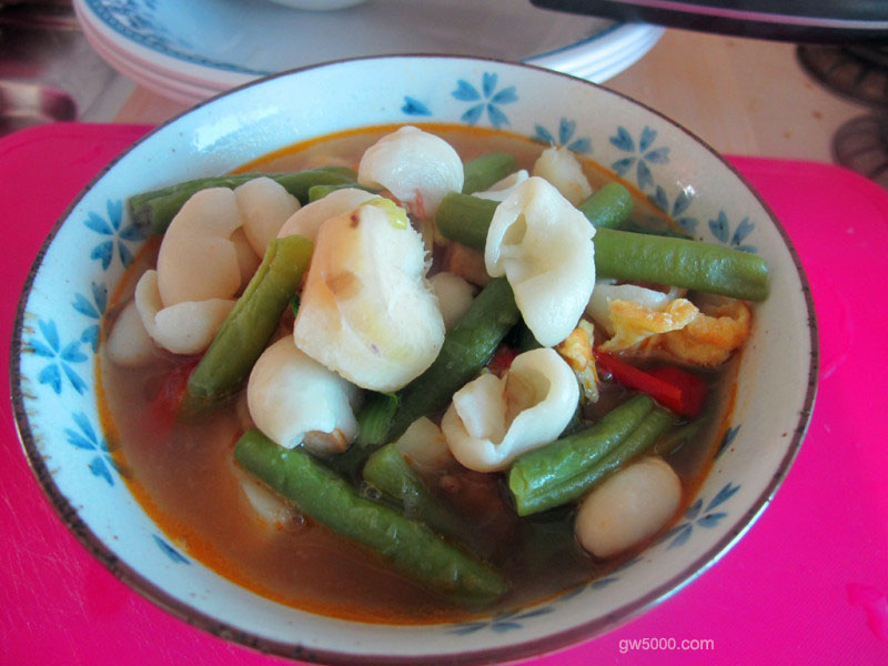 - 12将煮好的豆角和西红柿倒入锅中与猫耳朵同煮3分钟左右,加适量盐和鸡精即可食用
