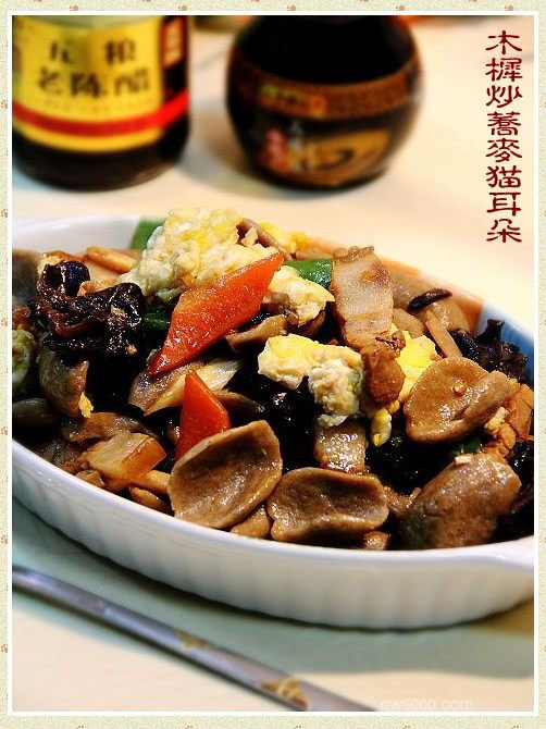 木樨炒猫耳特点;颜色搭配美观、配伍营养均衡、面片爽滑筋道、味道鲜香浓郁。