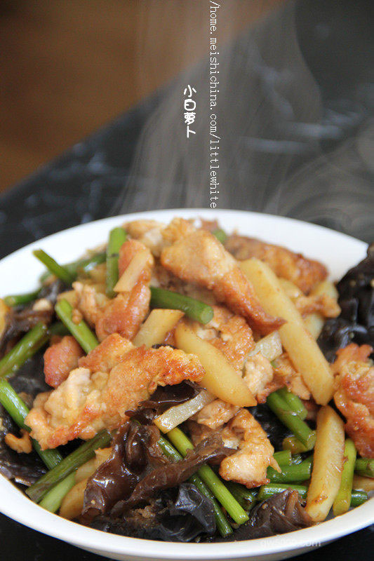 炒至土豆将熟,放入蒜薹木耳翻炒,可加入适量老抽。