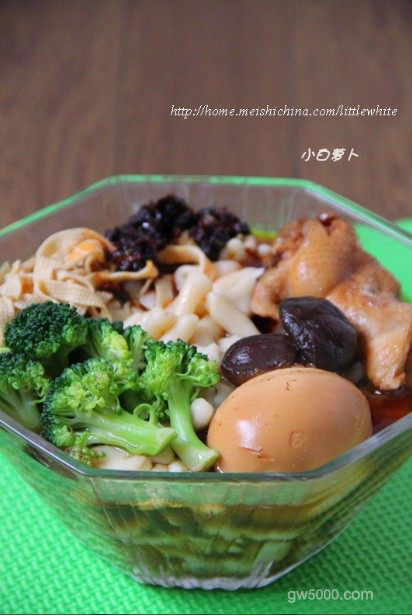 - 11煮熟后,将卤汁浇在猫耳朵上,周边摆上卤鸡腿、卤蛋、焯熟的西兰花、豆腐皮丝即可,我还放了一勺老干妈辣酱。