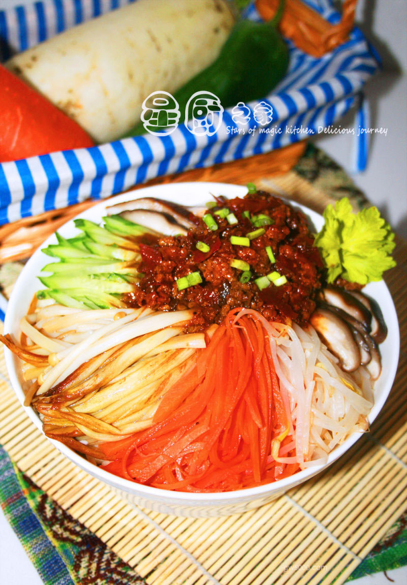 - 1准备所有的材料,胡萝卜,黄瓜,蘑菇,金针菇,五花肉馅(我已经提前剁碎了,剁碎的馅已经和葱姜剁在一起了),豆芽,干黄酱,甜面酱。