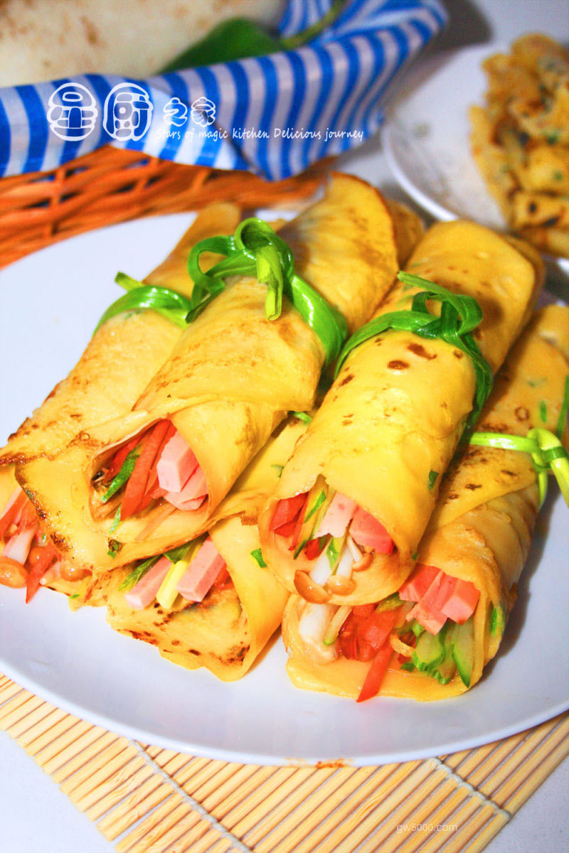 - 9煎好的鸡蛋饼,抹上甜面酱,这样包上胡萝卜丝,黄瓜丝,火腿肠,金针菇卷起就好