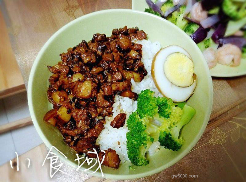- 8盛上一碗饭,舀一大勺带汤汁的卤肉,放上半颗卤蛋,点缀几颗青菜,这一碗饭,当真是色香味俱全了,吃的时候用勺子拌着,油花花的一碗,看着就欲罢不能