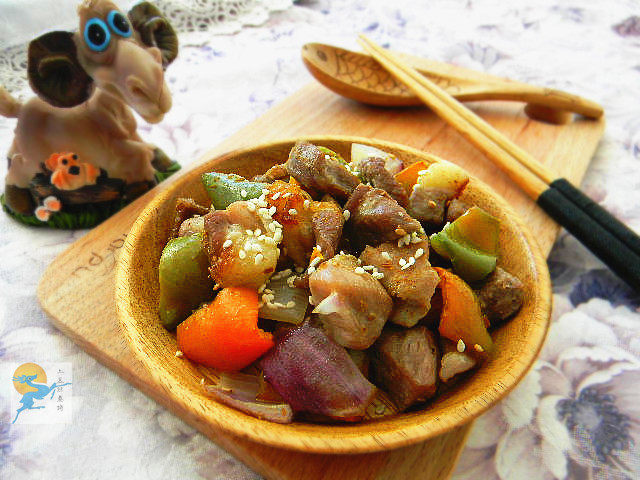 2洋葱和大青椒也切成约1.5cm见方的块。