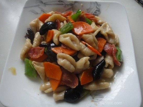 - 7起油锅,葱姜末爆出香味,依次放入配菜和猫耳朵,加少许生抽、糖、盐,翻炒均匀即可,猫耳朵和木耳最后放哦。成品出锅,真的很香。。。既可当主食也可当菜吃。