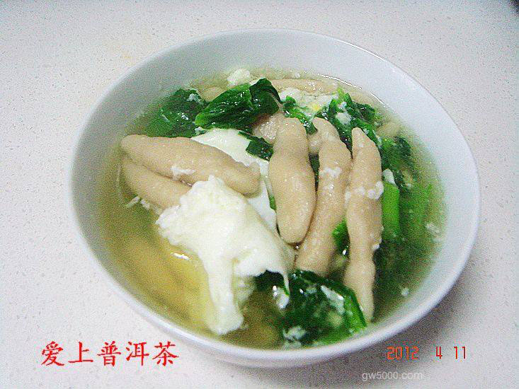 炒青菜,青菜半熟时取出,炒锅中放开水,打入鸡蛋,放入面鱼,加入盐,少许酱油,为保持颜色鲜绿,不放酱油也可。快熟时放入青菜
