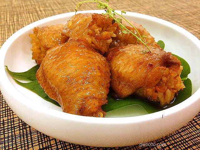- 10把去骨的鸡翅每一个都填充米饭,用小勺子灌进去