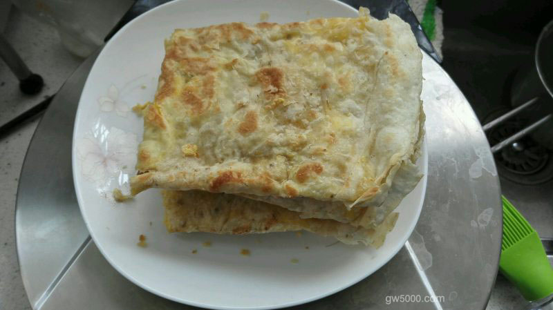 把鸡蛋打散平铺在烙馍上,加少许盐、孜然,再平铺另一张烙馍在上面
