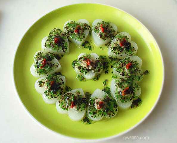 - 10将步骤9中的料汁均匀地浇在蒸好的萝卜上。