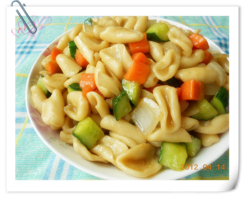 准备好一盆凉白开把煮好的猫耳朵捞出放入凉水中过凉