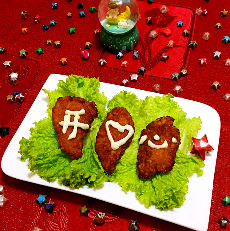 - 15盘中摆入生菜,放入鸡排用沙拉酱点缀一下