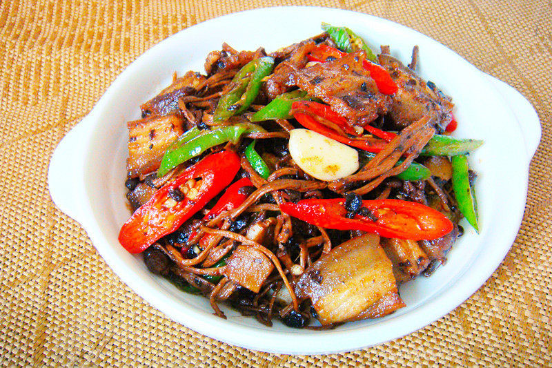 这次把经常吃的一道青椒回锅肉做了一下改良,加入了干的茶树菇和阳江豆豉。阳江豆豉是阳江人厨房里少不得的调味佳品。不管做什么菜,添一小把豆豉,便能化腐朽为神奇,变无味为有味。虽然我不是阳江人,但是我对阳江豆豉的喜爱一点也不亚于阳江人。此道菜虽然卖相不怎么好看,但是吃起来却别有一番风味。阳江豆豉的浓香加上茶树菇特有的菌类天然香味,令人齿颊留香,胃口大增。