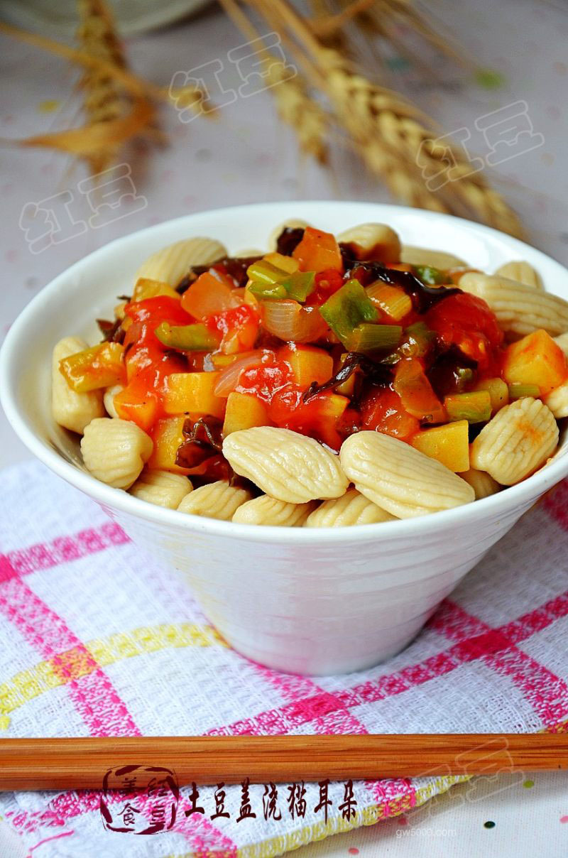 - 22把猫耳朵盛入碗中浇入土豆浇汁拌均匀即好。