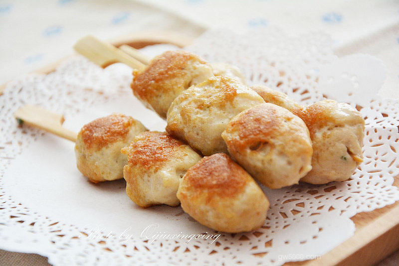 - 15戴上一次性手套,抓一把鱼糜,顺着虎口一捏,用勺子舀下,即成鱼丸。