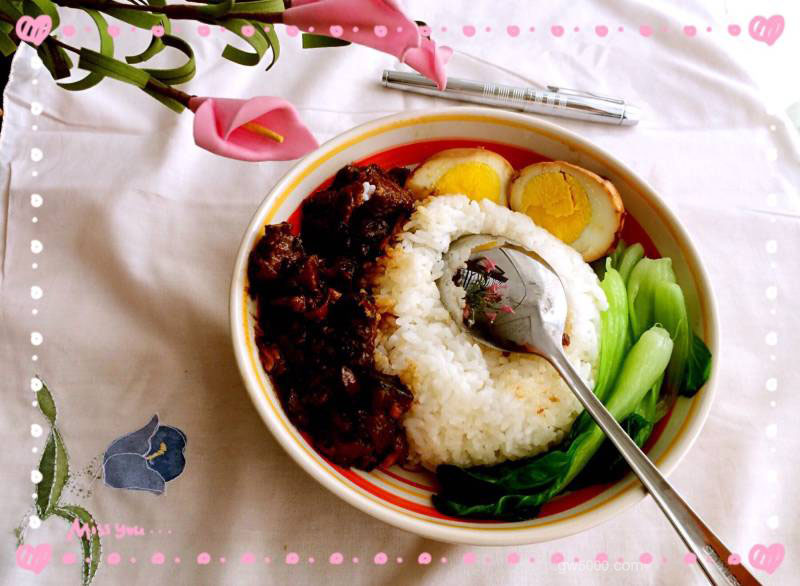 - 24盛一碗热乎乎的米饭,挖一大勺带着肉酱的卤肉,加上小青菜和卤蛋,完工。