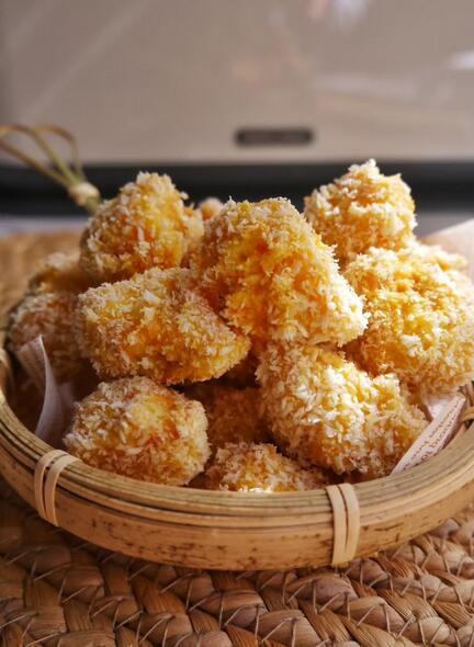 依次蘸满淀粉,鸡蛋液,面包糠
