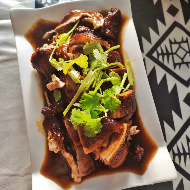 13鸭子斩件装盘,淋上汤汁,点缀香菜叶。成品色泽红润,甜咸适当,肥而不腻,嫩滑多汁,唇齿留香。