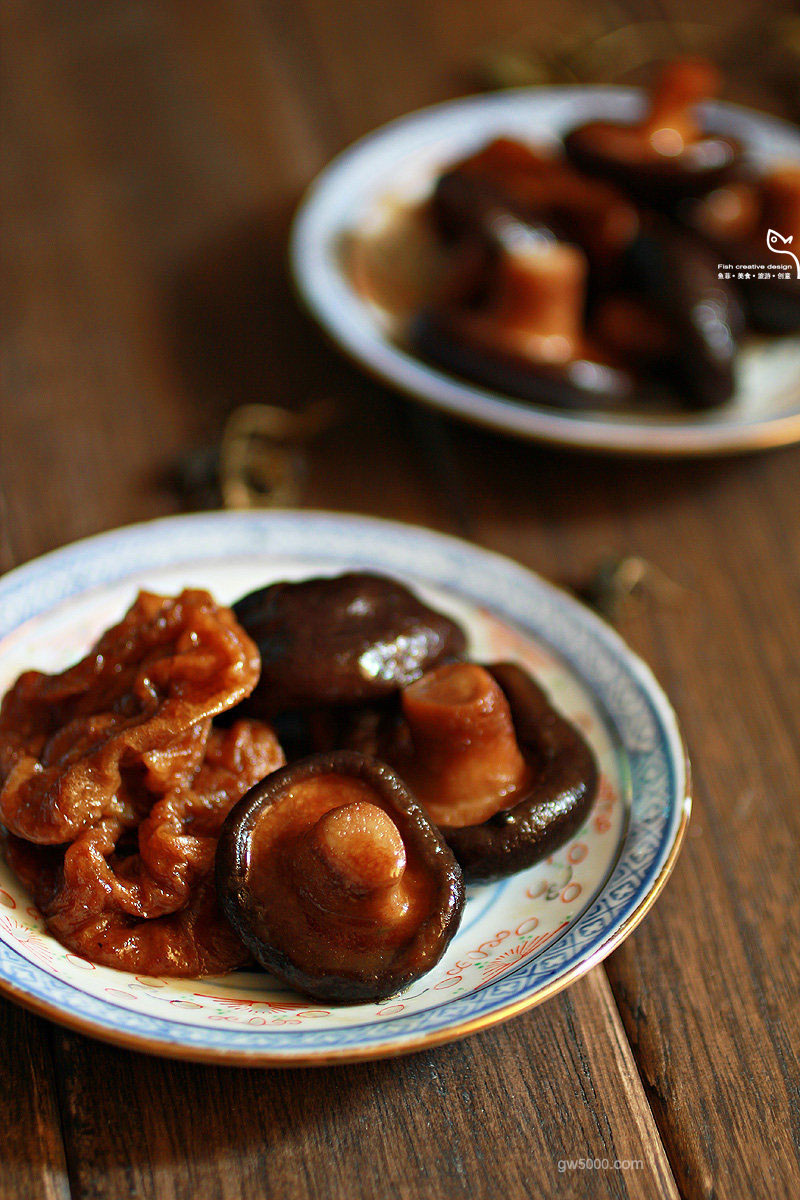 香菇泡水要晾干,否则下锅易油爆;金花菜干有阵阵淡香,放入后可去除香菇本身的吐水味。