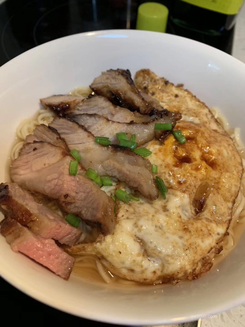 煮好后切片码在面上,再煎一个鸡蛋,儿子的早餐就做好了
