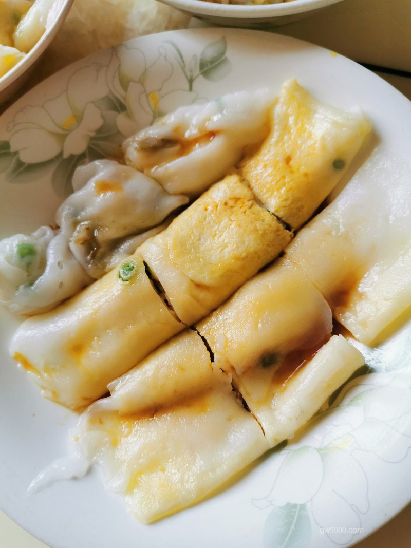 5最后将事先准备的生抽中按1:1加入开水后,淋在蒸好的肠粉上,即可。