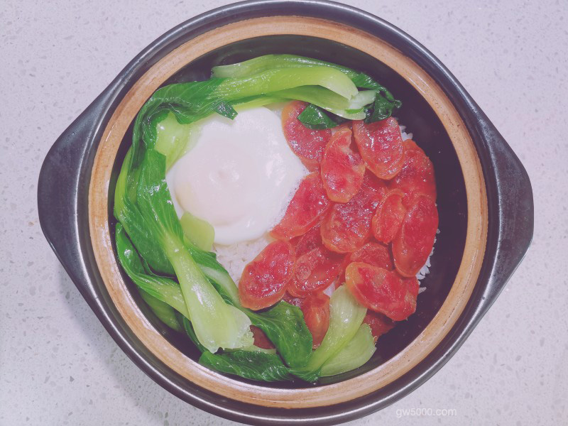 5焖饭的同时,将青菜放入开水中烫熟后码入锅中,加入煲仔饭酱油食用即可。