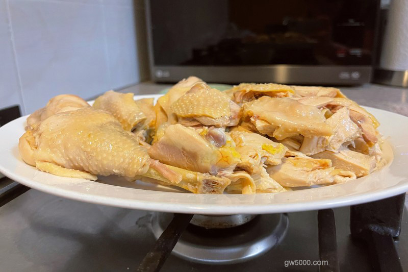 - 4泡在冷水里五分钟后捞起来。别人说要泡冰水,我觉得现在大冷天的泡普通冷水就够凉了。这个步骤主要让鸡皮保持爽滑,而非软塌塌的。