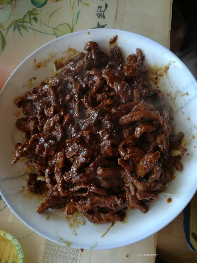 少倒入些油,小火将葱,姜爆香,加入甜面酱混合物炒香,放入肉丝,翻炒出锅。
