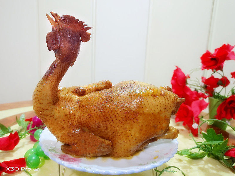 6鸡冷却后斩件,装盘,码成形,把锅里的鸡汁淋在鸡块上或装入小碗蘸着吃,最后淋点香油,撒点葱花,摆几棵香菜点缀即可。