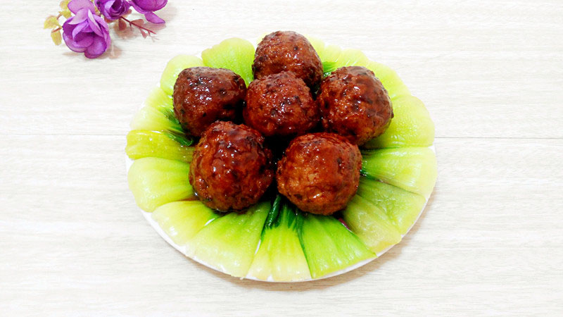 11锅中烧开水,把洗干净的油菜放入锅中,再放少许盐焯出摆放盘中,把狮子头盛放在上面即可食用。