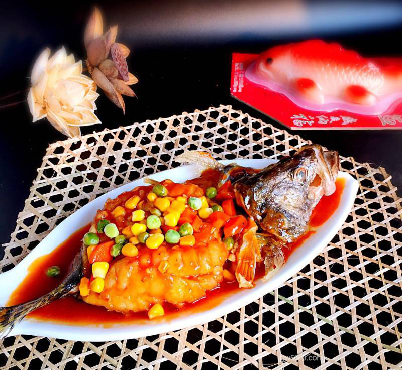 7炒锅用大火烧热下油,烧至八成热时,先用手倒拎住鱼肉,把锅中烧热的油从上往下浇在鱼肉上(这样可以把切了花刀的鱼肉先定型)。再把将两片鱼肉翅起鱼尾,放入油锅稍炸使其成形