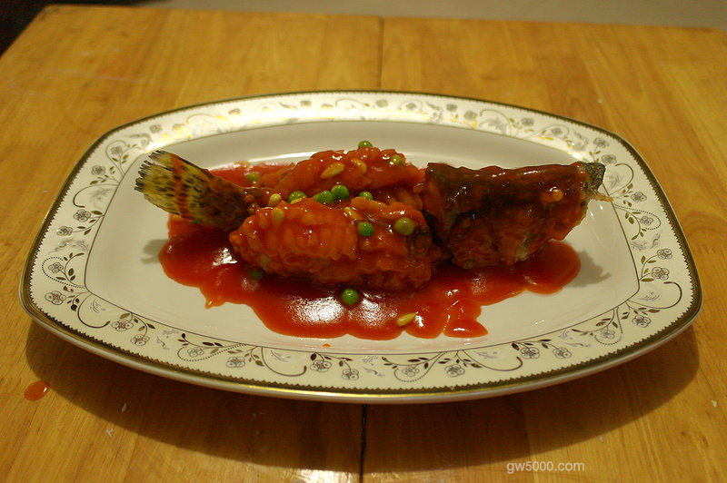 - 8均匀浇在鱼身上,撒上松子和青豆