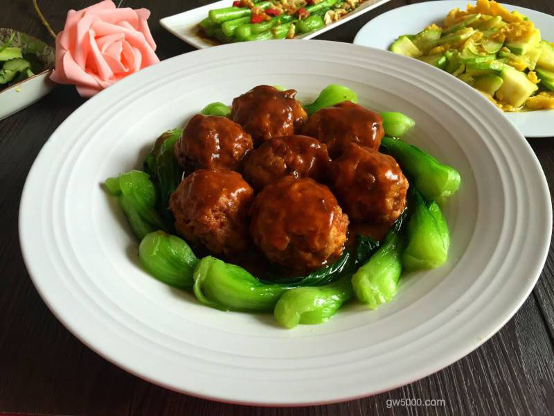 8另起锅,将洗净对半切开的小油菜放入热水中加少许油和盐焯熟将油菜摆于盘边,蒸好的丸子放在油菜中间,去掉葱姜丝,将蒸肉丸的汁倒入锅中,加入适量水淀粉收成浓稠的芡汁,浇在丸子上,美味的红烧狮子头,好吃到没朋友,嘟嘟宝贝一口气吃了两口半。