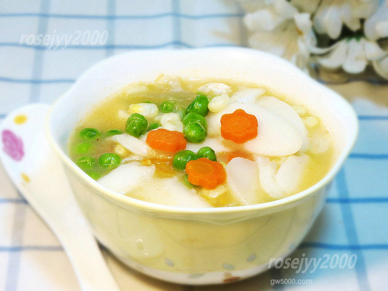 3锅里放水,放韩国辣白菜,慢火熬约15分钟,让辣白菜出味,再放青豆、玉米、红萝卜,烧约5分钟;