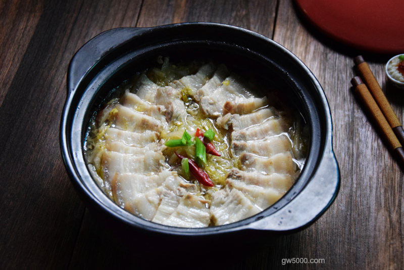 酸菜白肉里酸菜吸了肉的浓香,口感脆嫩,非常爽口;而肉片中带着酸菜的香味肥而不腻,吃的时候可以配一碟蒜泥酱油蘸肉片,香辣开胃。